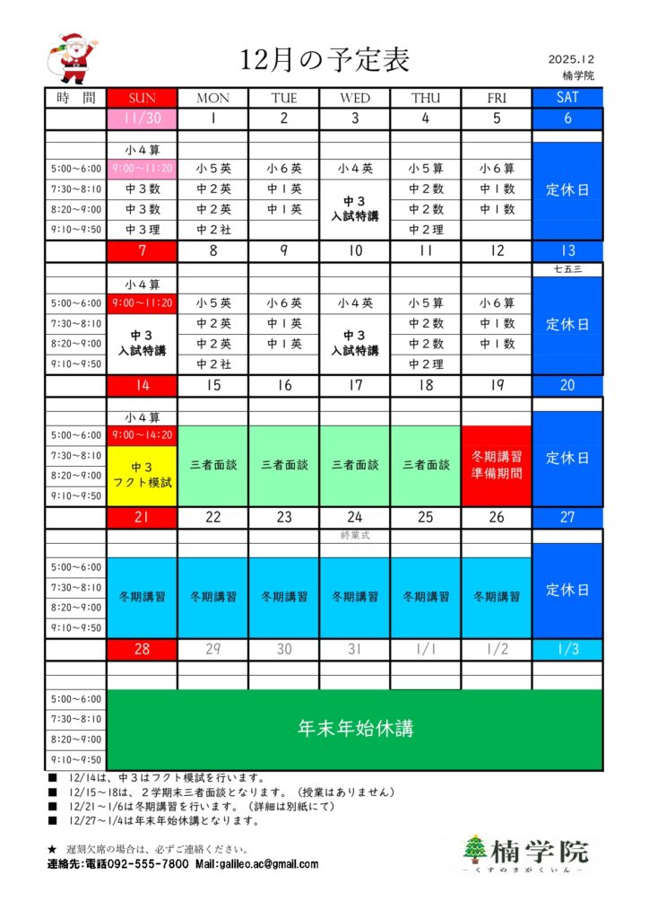 令和7年12月の予定表 スケジュール 2025.12.01 12月の予定表を公開いたしました。・12/14(日)の中3はフクト模試を行います。・12/15(月)~18(木)は三者面談を行います。・休講日 小6・中1 12/19(金)・年末年始休講 12/27(土)~1/4(日)